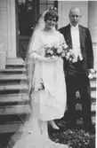 "26 juni 1919". Bröllop mellan Margareta Carlsdotter-Sparre och Folke Bertilsson-Sederholm. De har fotograferats på gårdsplanen framför huvudingången till Gunnebo slott.