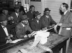 "Försöksdagen samlade sexhundra jordbrukare" - ingenjör N Berglund demonstrerar pappersskördegarn, Lantbrukshögskolan, Ultuna, Uppsala juli 1942