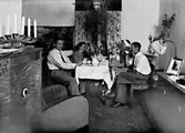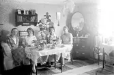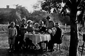 ERIK RUDS FÖRÄLDRAR, SYSKON OCH SYSKONBARN I RYTTARÄNGEN VID DUKAT KAFFEBORD FRAMFÖR HUSETS VERANDA