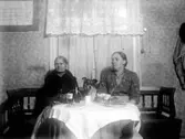 Två kvinnor och tre män vid kaffebordet i trädgården. Enligt uppgift är det August och Augusta samt Maria och Karl.