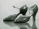 Tangoskor. Ett par damskor i ljusbrun mocka med hög klack, öppen tå och svart vristrem samt ett par högklackade damskor, vita med svart tå och vristrem.