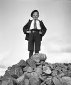 "Målarns Gustav" står med händerna i sidorna på toppen av ett stenröse. Gossen är finklädd i skjorta, slips, kavaj, kortbyxor, keps och ett skärp med glänsande runt spänne.