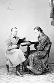 En äldre man i träskor sitter vid ett fönster och läser. På borden står pelargoner och väggen har en blommig tapet. Det är Åke Lundqvist, mannen som 1895 sålde sin gård till Skansen - Oktorpsgården.