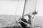 Män från Stockholms segelsällskap som deltagit i segling om 1:a klassens vandringspokal. Här på klippan med pokalen.