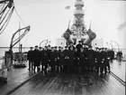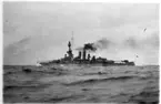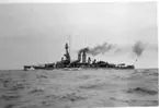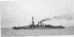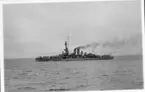 Pansarskeppet Drottning Viktoria vid utrustningspiren Pansarskeppet Gustav V i bakgrunden.