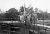 Grupp män och kvinnor samlade för fotografering. Utfärd Hjalmar Svensson & Co.