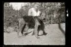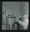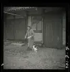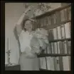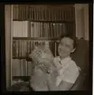 564 Vårgårda Havregryn. En kvinna sitter i en fåtölj med en hund i knät.