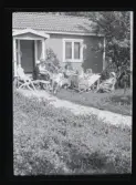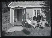 Ett sällskap vuxna och barn fikar utomhus.