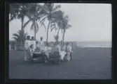 En grupp människor sitter tätt tillsammans i en interiör. En kvinna står bakom dem med armarna lätt utsträckta, och en annan håller en flaska. I bakgrunden syns tapet, gardiner, fönster och en elementradiator