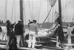 Från Hotellviken, Saltsjöbaden september 1946. Den damsegling som omtalas i baksidesanteckningen ägde rum 7 september. Anteckningen "Seglade för SSK eller Sthlms Starbåtsflottiljen" syftar på Bengt Melin, som var medlem av Stockholms Segel Klubb, hans hustru Inger seglade för Stockholms Segel Sällskap (KSSS årsbok 1947 s 222). I seglingsprotokollet anges fru Bengt Melins namn som Inga, men Melins svåger, tillika SSHM-medarbetaren Folke Sjödin, som gjort anteckningen, har uppgivit hennes namn som Inger. Jfr Fo157054 och -055 i KSSS-samlingen. Fotografiet återgivet i Till Rors årg. XII (1946) nr 37 s 11.