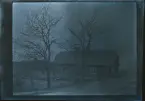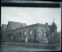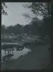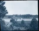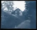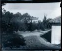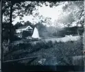Vy över trädgård. En träbänk står placerad framför en altan med snickarglädje. I bakgrunden skymtar Filipstad kyrka.