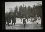 Två män assisterar en kusk att köra sin vagn dragen av två hästar på en färja.