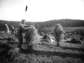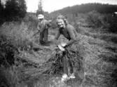 Skördar havre knyter neker. Sonja Svensson, Ella Persson och Albert Persson på åkern mot Stadvik, 1950.