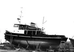 Medföljande text: "Myrens Mekaniska Verkstad, Strömstad. På slipen bogserbåten "Hövdingen" från Fredriksdal. Bilden tagen i slutet av 1930-talet eller i början av 1940-talet. Originalfoto tillhörande Allan och Erik Ljungqvist, Strömstad".