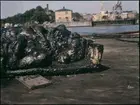 Vasa bryter vattenytan mellan de två bärgningspontonerna Oden och Frigg.