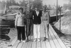 Det segrande laget från Saltsjöbadens Samskola som 3 juli 1932 under Österskärsregattan hemförde Oscar Holtermanns vandringspris, se KSSS årsbok 1933 s 116 ff och s 156 f. I laget ingick Lennart Blom (f. 1915), Bengt Folke (b. 1919), Sven Nicou (f. 1918) och Gunnar Blom (f. 1916), vem som är vem på bilden är inte bekant. Fotografiet återgivet i a a s 117. Bakom pojkarna t v skymtar ordföranden i KSSS volontäravdelning, Carl Matthiessen.