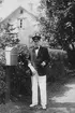 Ett äldre par. Bostadshus i bakgrunden. Båtbyggare Ljungdahl