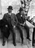 Professor Rutger Sernander och landshövding Nils Edén studerar Bellarius sten i Forsmarks herrgårdspark