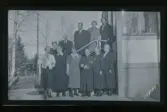 "Hälleforsnäs." Grupporträtt. Kvinnor och män poserar på trappen till ett hus.