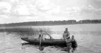 Två män i bar överkropp och badbyxor. Den ena badbyxan med mönster av surfande figurer och höga vågor. Nordiska Kompaniet. Från Nordiska Kompaniets kampanj med Californiakläder i maj 1947.