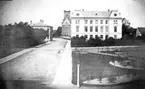 Skara. Malmgatan. Kyrkan och "gula hönan" från Veterinärgatan, slutet av 1940-talet.