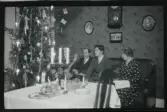 Jul. Dopp i grytan. Familj doppar i bröd i gryta med skinkspad som står på järnkamin. I förgrunden häller äldre man upp mumma i ett stop.