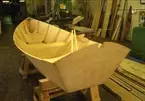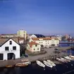 barkar liggande förtöjda vid slup o barkass Stumholmen i bakgrunden Marinmuseum med Jarramas