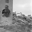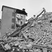 Fyra uppklädda unga kvinnor står på en väg framför ett lägenhetshus, Mölndal 1939 - 1941. Kvinnorna är troligtvis arbetskamrater vid Mölndals sjukhus. Bilder från fotoalbum, tagna från södra sidan av Länsmansgatan vid Mölndals lasarett/sjukhus 1939 - 1941 på bland annat givarens mor Ester (född Johansson) tillsammans med kollegan/väninnan Aina Englund. De arbetade på den manliga kirurgavdelningen som vårdbiträden/undersköterskor. Relaterade motiv: 2024_1542 - 1617.