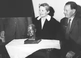 Bystprotes 23 februari 1966 I förgrunden syns fru Litzen som är klädd i en vit rock med en virkad tröja inunder. Hon bär glasögon och ett armbandsur på sin vänstra handled. Hon håller en bystprotes i sina händer. Hon har håret uppsatt i en hög frisyr. På bordet bakom frun skymtar det ett bord med flera bystproteser.