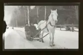 "Sofia, Alfred Eklund, Sofielund" En man och en kvinna i en släde dragen av en vit häst.