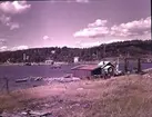 Vägstation AC9, Skellefteå, färjvaktarbostad Örviken. Bostadshus för färjvaktaren. Förrådsbyggnad till vänster. Invid väg med ortnamnsmärke (ortnamnskylt) "Örviken".