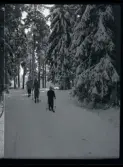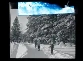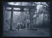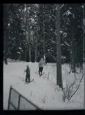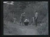 Svartvitt fotografi av fyra personer i skogsmiljö. Två personer ligger eller sitter i gräset i förgrunden medan två står bakom dem bland träd och vegetation. Lummig skog med björkstammar och tät undervegetation.