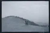 En person vandrar genom ett stenigt fjällandskap med bergsryggar i bakgrunden. Terrängen består av lösa stenar och branta sluttningar.