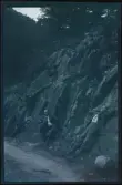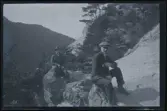 Person sittande i skogsterräng bland vegetation och stenar. Personen håller ett litet föremål i handen skulle kunna vara en macka eller en svamp.