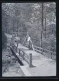Svartvitt fotografi av tre personer och en hund i en roddbåt på lugnt vatten. En man sitter vid årorna, mittemot en kvinna i ljus klädsel och ytterligare en person. Vass och träd kantar stranden och i bakgrunden syns en bro.