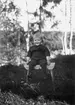 "Gosse från Husom." En liten glad pojke sitter på en pall. Lima socken, Dalarna