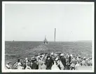 Manskap med livbälten på räddningsflottar och andra besättningsmän badande intill kryssaren GOTLAND.