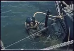 Vasa bryter vattenytan mellan de två bärgningspontonerna Oden och Frigg.