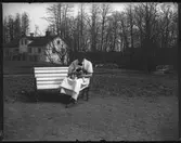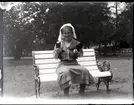 "Husmodersskolan". Kvinna sitter på parkbänk med hund i knät.