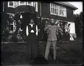 "Husmodersskolan". Ung kvinna och man i uniform, stående utanför Husmodersskolan. Kvinna i randig klänning gömmer sig bakom buskage.