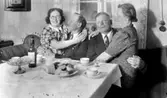 FAMILJ SAMLAD RUNT KAFFEBORDET. EN TRATTGRAMMOFON STÅR I BAKGRUNDEN.
