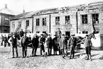 Det här är en gruppbild över den lokala, frivilliga personalen som hjälpte till med Arbogautställningen. De har radat upp sig, för fotografering, på den stora scenen. Längst till vänster står tre identifierade personer; Ryttmästare Egnell (i keps). Han är utställningens ceremonimästare och skötte kontakterna med kungahuset (Flera medlemmar av den kungliga familjen kom till Arboga i samband med firandet av Sveriges Riksdags 500-årsjubileum. Kung Gustaf V hann med ett besök på utställningen också). Mannen i svart plommonstop är Bertil Post, medlem i bestyrelsen. Mannen i ljusare hatt och överrock är Sven Lind, utställningskommissarie.