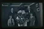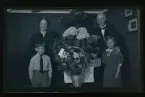 "Anna o Gustaf Karlsson, Hälltäppan." Porträtt av en familj som står vid ett bord fullt av gratulations-blommor.