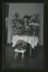 "Anna Johansson (Axels kusin), Abbotnäs." Porträtt av en kvinna som sitter vid ett bord med gratulations-blommor.