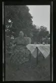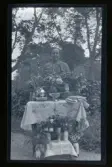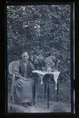 "Augusta Persson, Berga, kusin till Maria Eriksson. /A-LE." Porträtt av en kvinna som sitter utomhus vid ett bord med gratulations-blommor.