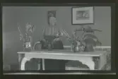 "Så kallade Moster Malin, Fogelstad." En kvinna står vid ett bord med gratulations-blommor.