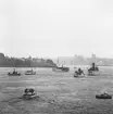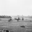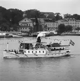 Närmast syns ångf Polstjerna, bakom stäven ligger ångf Nya Kinda. Flera namnkända fartyg på andra sidan Göta kanal.