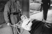 "Karantänsförläggning" på Kvarnbyskolan för flyktingar från koncentrationsläger i Tyskland 1945. Manlig flykting som bärs på bår.