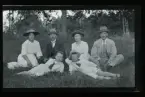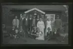 "Kaffebjudning vid Nilslund." Grupporträtt. Kvinnor, män och ett barn poserar framför ett hus.
