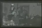 "I Österåker, sovande grupp i blixtljus." Ett sällskap kring ett bord dukat med kaffekoppar, nästan alla blundar.